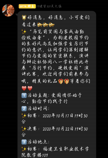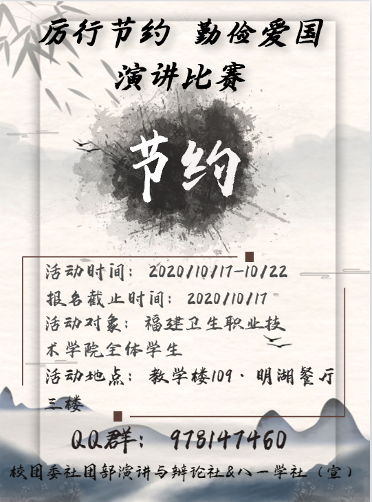 2020年8月,習近平總書記作出重要指示:要堅決制止餐飲浪費行為,切實培養節約習慣,在全社會營造浪費可恥、節約為榮的氛圍。為了響應習近平總書記的號召,傳承勤儉節約的傳統美德,構建校園節約的良好風尚及加強厲行節約的意識,讓同學們更為深刻理解節約與愛國的緊密聯系,2020年10月17日晚,演講與辯論社及八一學社在我校教學樓109室聯合舉辦主題為“厲行節約,硬核愛國”的演講比賽。