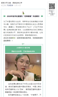 暮冬來(lái)襲,美音環(huán)繞。習(xí)近平新時(shí)代中國(guó)特色社會(huì)主義思想讀書社“星星隊(duì)”迎來(lái)了一年一度的經(jīng)典朗讀大賽。為期半個(gè)多月的活動(dòng)于12月26日在教學(xué)樓309落下帷幕。此次活動(dòng)經(jīng)過(guò)前期的策劃,全體隊(duì)員的參與,于12月10日通過(guò)易班優(yōu)課平臺(tái)和讀書社“天使吾修”微信公眾號(hào)開(kāi)展了朗讀大會(huì)以及大眾投票環(huán)節(jié)。