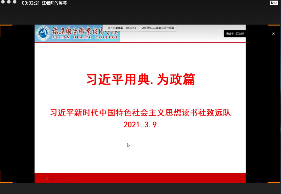 2021年3月9日,習近平新時代中國特色社會主義思想讀書社致遠隊線上開展了社團選修課《習近平用典》“為政篇”學習。本次課由社團指導老師江洪老師主講,全體選課同學按時參加了學習。
