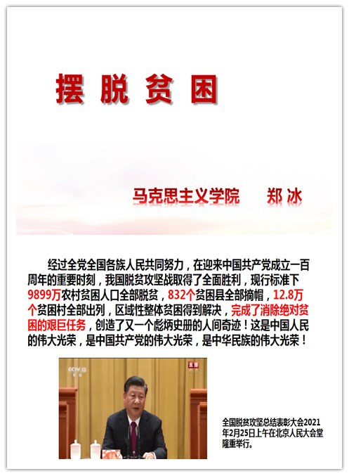 課上,鄭冰老師通過打贏脫貧攻堅戰(zhàn)主題歌曲《和你在一起》導入本次課程,并傳達了習近平總書記在全國脫貧攻堅總結表彰大會上的講話精神,讓同學們深刻認識到學習《擺脫貧困》的重要性和意義。緊接著鄭冰老師從習近平同志簡歷、《擺脫貧困》創(chuàng)作背景、《擺脫貧困》主題思想、作品文風四個方面為大家進行授課,讓大家了解《擺脫貧困》創(chuàng)作背景,明確《擺脫貧困》主題思想。通過了解作者的簡歷和創(chuàng)作背景,從而把握作者極富創(chuàng)造性的戰(zhàn)略思想、極富前瞻性的制度理論和極富針對性的實踐觀點,為后續(xù)學習奠定了一定的基礎。
