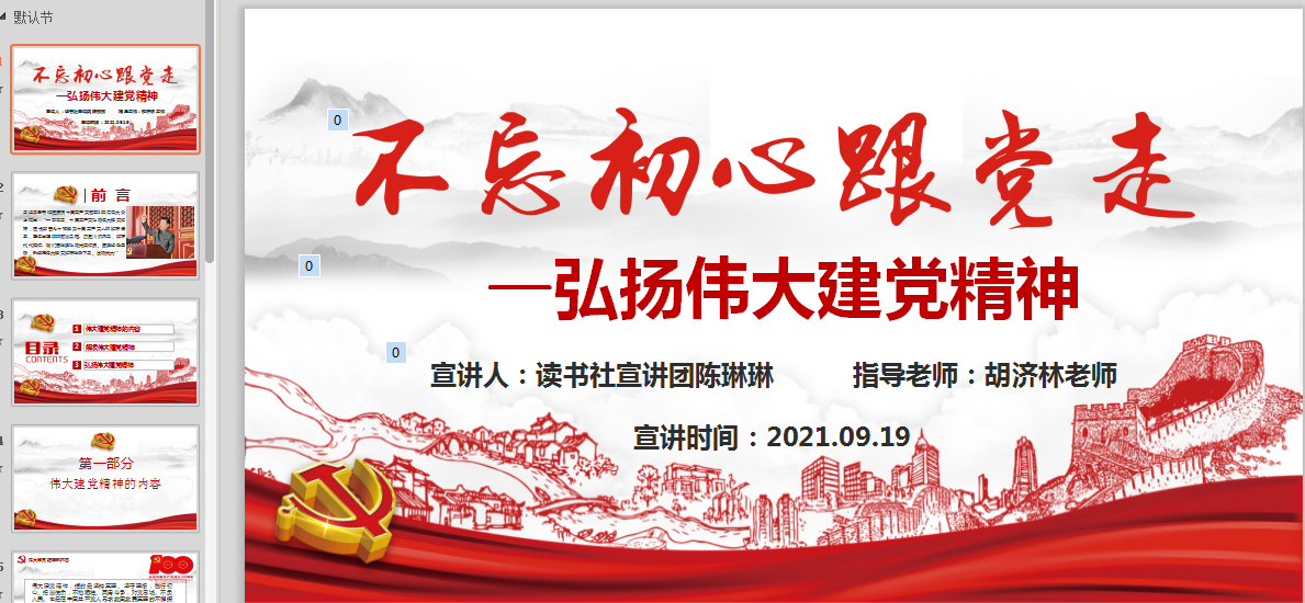 2021年9月19日下午,在胡濟林老師的指導下,習近平新時代中國特色社會主義思想讀書社宣講團在線上通過騰訊會議,為20中醫養生保健301班、20營養301班開展“不忘初心 跟黨走----不忘初心 跟黨走—弘揚偉大建黨精神”主題宣講。