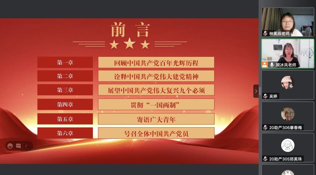 為進一步推進學習、宣傳和貫徹習近平總書記“七一”重要講話精神,引導社團成員深入領會講話精神的重大意義,深刻把握豐富內涵,不斷提高政治判斷力、政治領悟力、政治執行力,為實現中華民族偉大復興的中國夢貢獻自己的青春力量,2021年10月8日晚,馬克思主義學院顏冰鳳、林美辰兩位老師為傳統節日研習社全體成員開展了線上學習宣講。