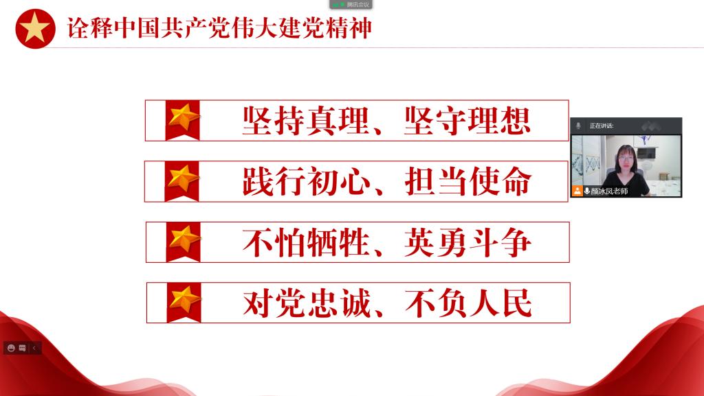 會議開始,顏冰鳳圍繞“回顧中國共產黨百年光輝歷程”,依此向同學們講述了“詮釋中國共產黨偉大建黨精神”“展望中國共產黨偉大復興九個必須”“貫徹‘一國兩制’”“寄語廣大青年”“號召全體中國共產黨黨員”等六個部分的內容,使同學們更加深入了解中國共產黨的百年風雨光輝路程,引導同學們深入學習領會黨團結帶領人民不懈奮斗取得的偉大成就,不斷汲取前行的力量,為實現第二個百年奮斗目標匯聚青春力量。