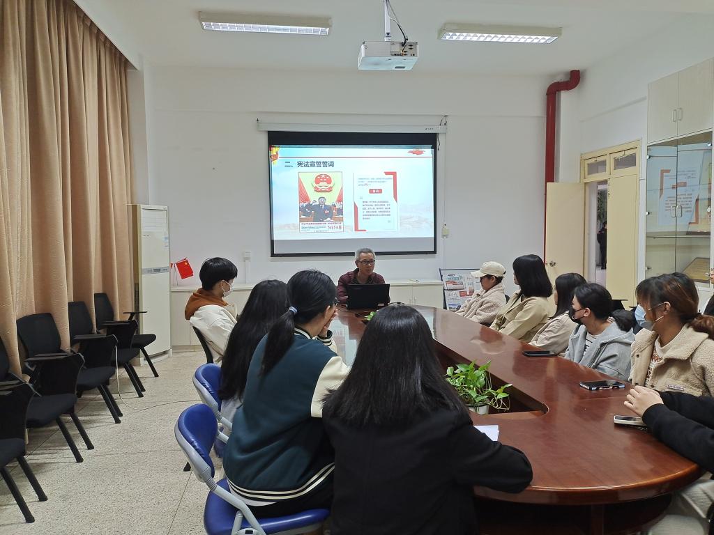 胡濟(jì)林首先帶領(lǐng)同學(xué)們觀看《國(guó)家憲法日》宣傳片,讓學(xué)生對(duì)憲法日的由來(lái)與內(nèi)涵有了初步的了解。接著胡濟(jì)林作《學(xué)習(xí)宣傳憲法弘揚(yáng)憲法精神》的專(zhuān)題報(bào)告,從國(guó)家憲法日的設(shè)立入手,給同學(xué)們介紹了憲法的概念、憲法宣誓制度、憲法的主要特征、公民的基本權(quán)利和基本義務(wù),強(qiáng)調(diào)憲法在中國(guó)特色社會(huì)主義法律體系的決定性作用。胡濟(jì)林號(hào)召同學(xué)們要學(xué)好憲法,學(xué)習(xí)宣傳好習(xí)近平法治思想,大力弘揚(yáng)社會(huì)主義法治精神,推進(jìn)國(guó)家治理體系和治理能力現(xiàn)代化。