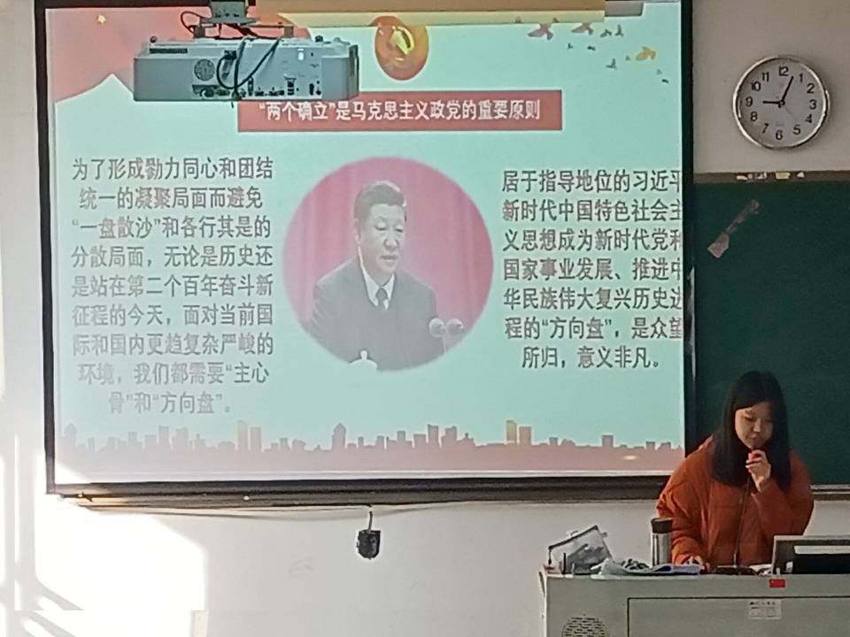 開展本次宣講的是王佳瑤和林宇珊小組,宣講人是王佳瑤,她首先向大家介紹了黨的十九屆六中全會中“兩個確立”的內容,接著從“兩個確立”是馬克思主義政黨的重要原則、“兩個確立”是中華民族站起來富起來強起來的重要經驗及“兩個確立”是全面建成社會主義現代化強國的重要保障等方面講述了“兩個確立”的決定性意義。