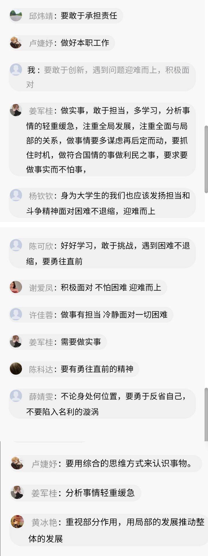 通過此次課程的學習,同學們深受啟發,表示要將習近平總書記的為政精神運用到學習和工作中,堅定理想信念、不怕困難、腳踏實地、努力突破自我,為國家的發展奉獻自己的力量。