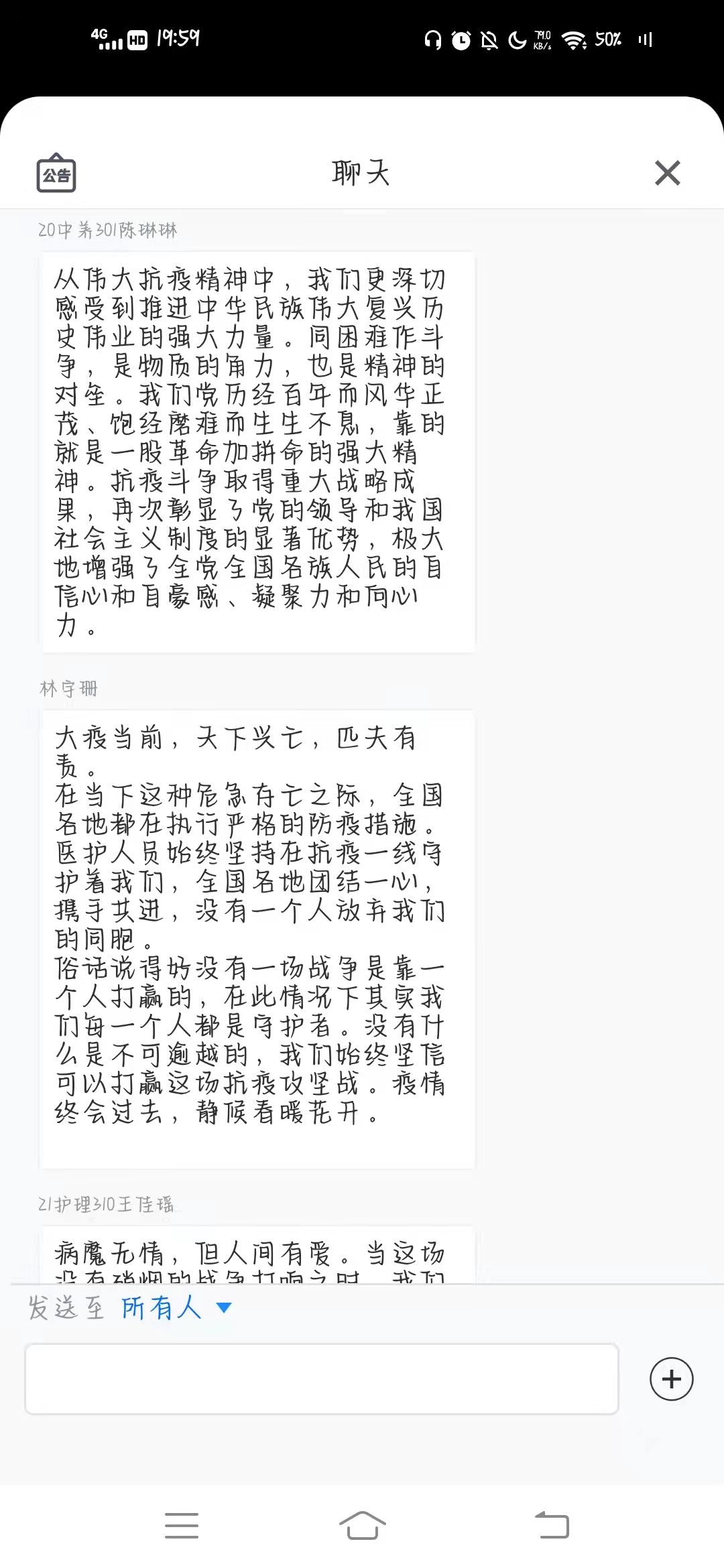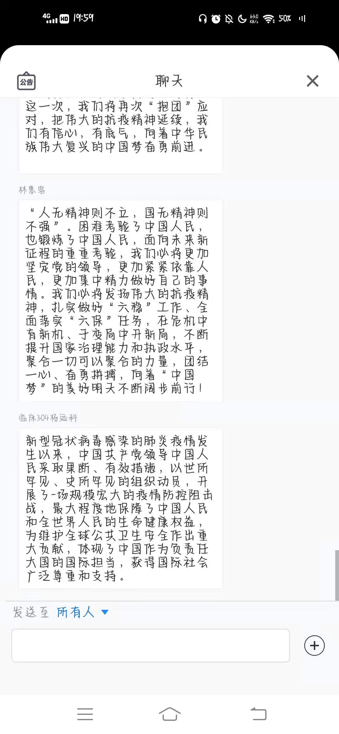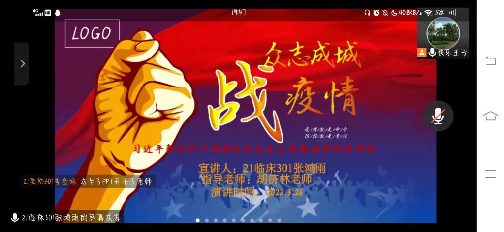 接著,會議進入了第二次議程:由宣講團成員張鴻雨同學匯報《眾志成城戰疫情》。他為我們講述了疫情之下的感人事跡,為我們展現了中國精神、中國力量、中國速度。現如今疫情還在不斷蔓延,但我們相信只要在黨的領導下,全國人民團結一心,眾志成城,全力以赴,奮力抗擊疫情,就一定能取得最終的勝利。匯報結束后,同學們在討論區發表了自己的感悟,進行了本次學習的交流討論。