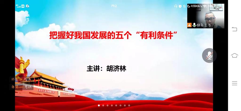 同學們進入騰訊會議后,由胡濟林進行《把握好我國發展的五個“有利條件”》的專題報告,胡濟林從“五個有利條件”相互間的關系出發,闡述了中國共產黨的堅強領導、中國特色社會主義制度的顯著優勢、持續快速發展積累的堅實基礎、長期穩定的社會環境、自信自強的精神力量等五個方面的內容。