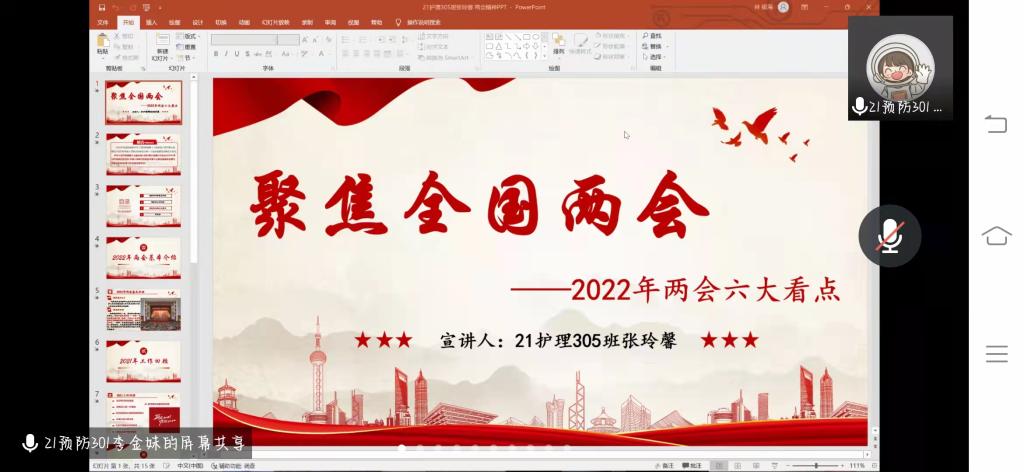 “新時代黨和國家事業在脫貧攻堅、抗擊新冠肺炎疫情等重大斗爭中取得的舉世矚目成就”,“只有在黨的堅強領導下,其他四個有利條件才能產生”,“在人類文明發展史上,除了中國特色社會主義制度和國家治理體系外,沒有任何一種國家制度和國家治理體系能夠在這樣短的歷史時期內創造出我國取得的經濟快速發展、社會長期穩定這樣的奇跡”,胡濟林解讀的這些內容,給同學留下了深刻的印象。接著,由李海丹同學匯報《學習貫徹兩會精神》、李金妹同學匯報《聚焦全國兩會》。兩位同學講述內容豐富,側重點不同,講解語言連貫,讓同學們深刻全國兩會精神,得到同學與老師的一致好評。