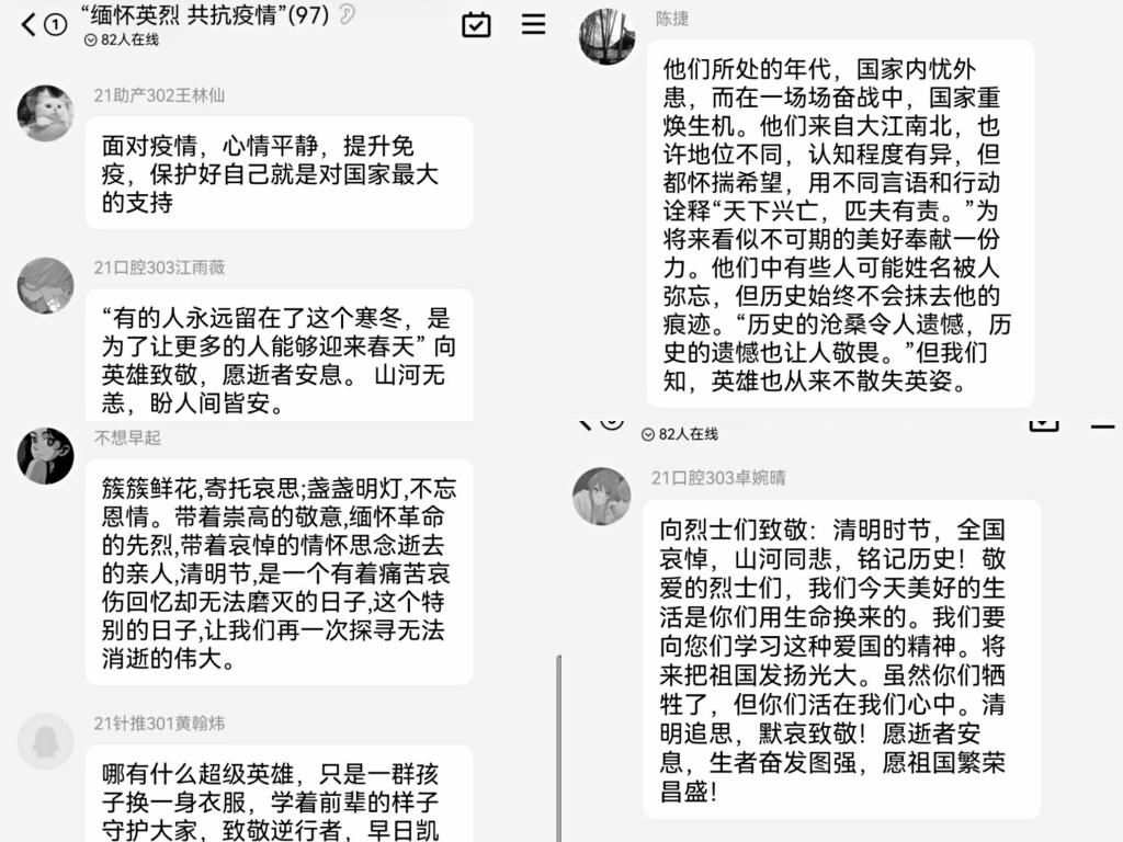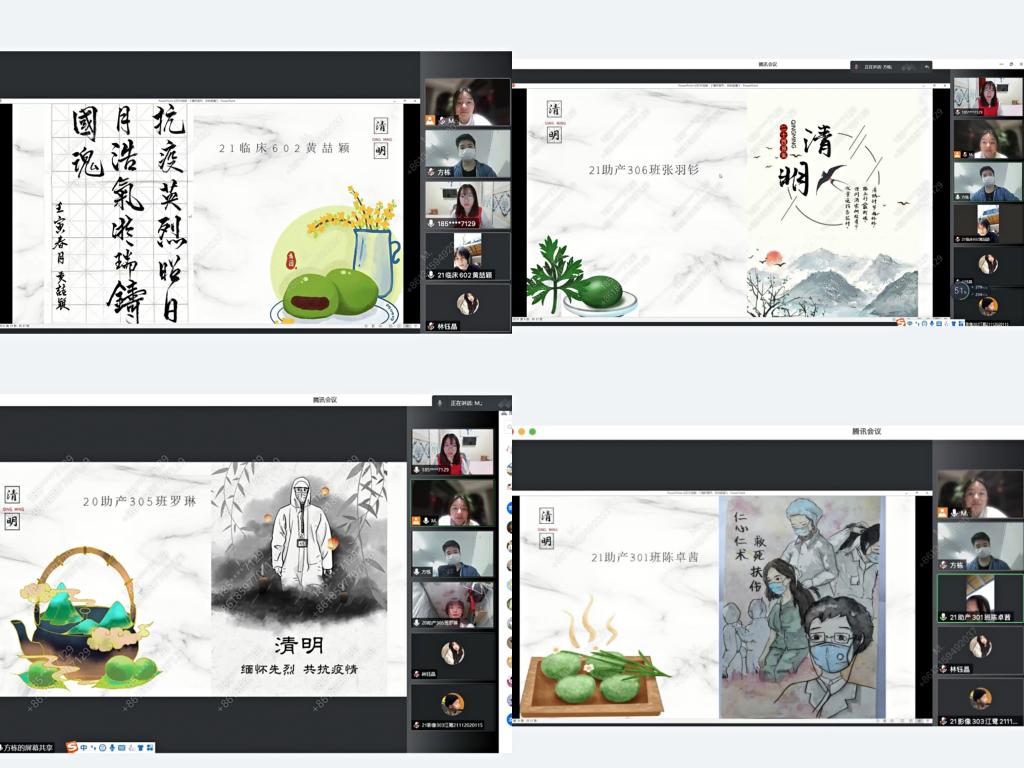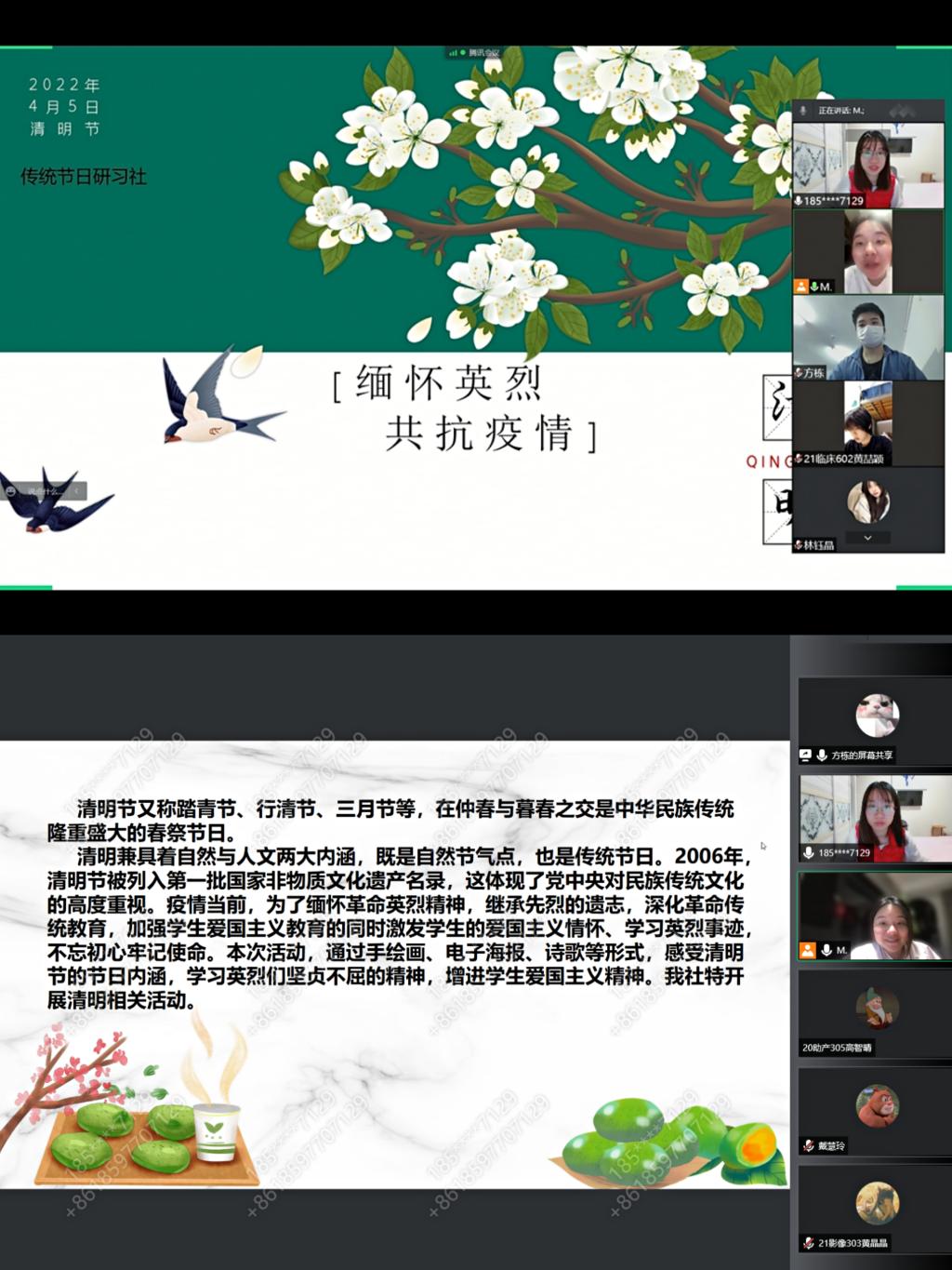 清明節又稱踏青節、行清節、三月節等,在仲春與暮春之交,是中華民族傳統隆重盛大的春祭節日。疫情當前,為了緬懷革命英烈精神,繼承先烈的遺志,感受清明節的節日內涵,緬懷抗擊疫情一線犧牲的醫護人員和工作人員,致敬疫情阻擊戰中的“逆行英雄”。我校傳統節日研習社于2022年4月7日組織同學們開展了以“緬懷先烈,共抗疫情”為主題的線上清明紀念活動。