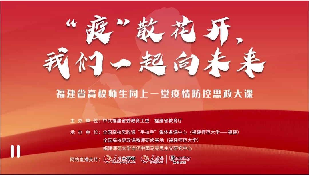 此次直播以“‘疫’散花開,我們一起向未來”為主題,邀請到了來自福建省各高校的五位教授,五位教授緊密結(jié)合高校思想政治理論課,講述我省抗疫一線的感人故事,解讀黨中央關(guān)于疫情防控的決策部署,教育引導(dǎo)廣大師生深刻認(rèn)識中國特色社會(huì)主義制度的顯著優(yōu)勢,牢記“兩個(gè)確立”、增強(qiáng)“四個(gè)意識”、堅(jiān)定“四個(gè)自信”、做到“兩個(gè)維護(hù)”。