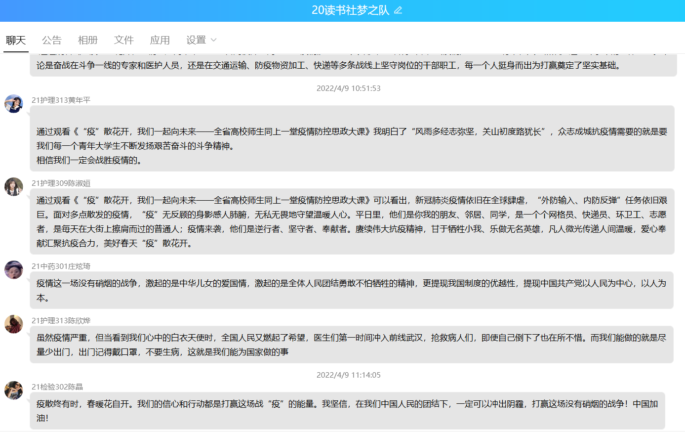 2022年4月9日上午,習近平新時代中國特色社會主義思想讀書社夢之隊齊聚云端,在指導老師鄭冰的帶領下,參加了由中共福建省委教育工委、福建省教育廳組織的“同上一堂疫情防控思政大課”活動。