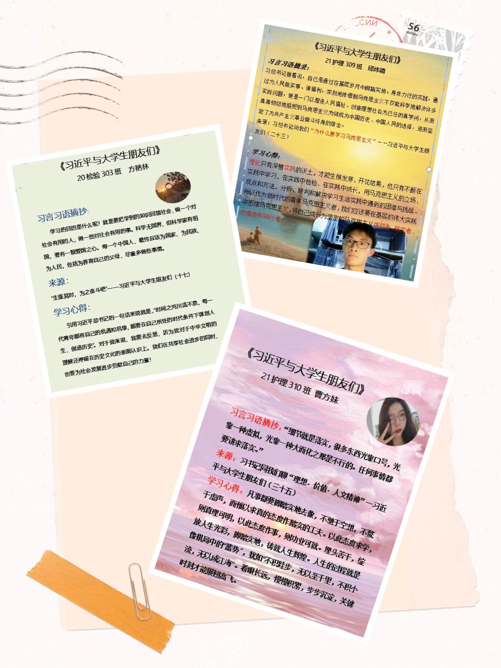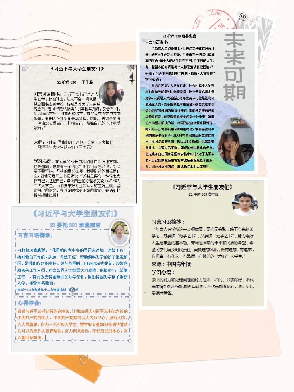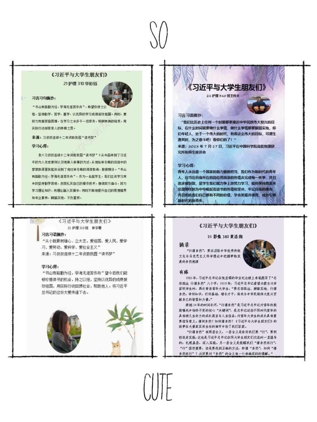 社員們從《習近平與大學生朋友們》包含的25篇采訪實錄中摘錄最喜歡的習言習語,并進行心得交流和作品展示。以下是部分隊員的作品展示: