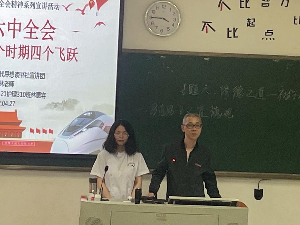2022年4月27日下午,習近平新時代中國特色社會主義思想讀書社宣講團在胡濟林老師的組織下,到教學樓112為21檢驗(高本貫通)501、21影像(高本貫通)501班開展黨的十九屆六中全會精神專題宣講。