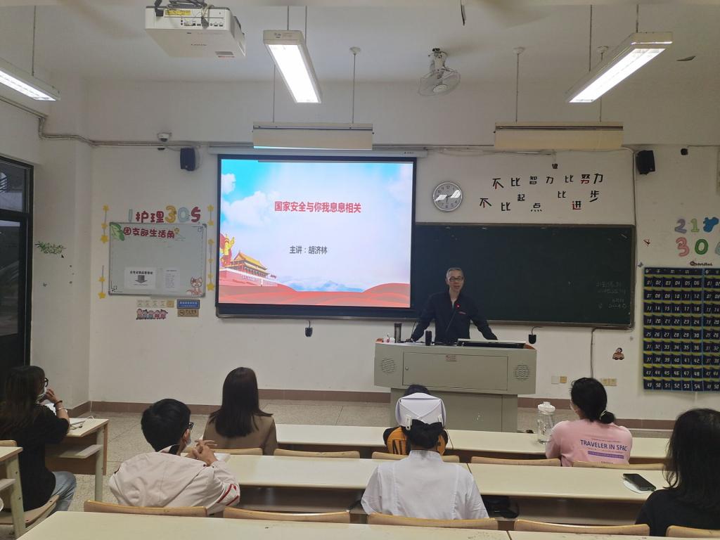 活動伊始,由胡濟林進行《國家安全與你我息息相關》專題的講解。胡濟林強調,我們每個人都是國家安全的共享者,是國家安全的共建者,也是國家安全的守護人,維護國家安全沒有局外人。胡濟林通過生動的講解,配合現場問答等互動方式,讓同學們增強了安全防范意識與自覺維護國家安全意識,懂得了在自身遇到危險的時候該如何保護好自己,避免發生一些不必要的機體損傷或精神損傷。同時,胡濟林向同學們普及防范金融詐騙、防范非法集資和銀行卡盜刷等知識,提高學生對金融安全的風險認知和防范意識。