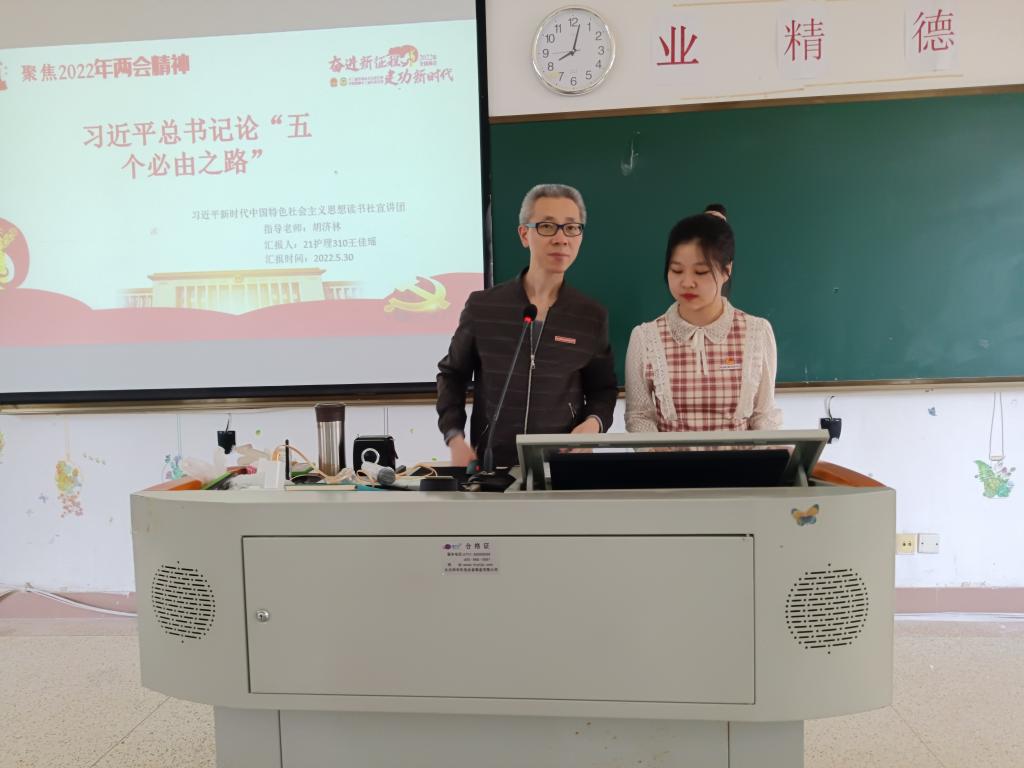 2022年3月5日,習近平總書記在參加十三屆全國人大五次會議內蒙古代表團審議時,用“五個必由之路”深刻揭示了中國答卷背后的成功密碼。為了更好地把握兩會精神,堅定“四個自信”,習近平新時代中國特色社會主義思想讀書社宣講團在5月30日上午,在馬克思主義學院教師胡濟林的指導下,到教學樓109為18衛管501、18藥經管501、18藥學501班開展線下學習交流。通過知識講座的方式,向同學們宣傳“習近平總書記論‘五個必由之路’”相關知識,不斷提升學生們對國家發展的認同。