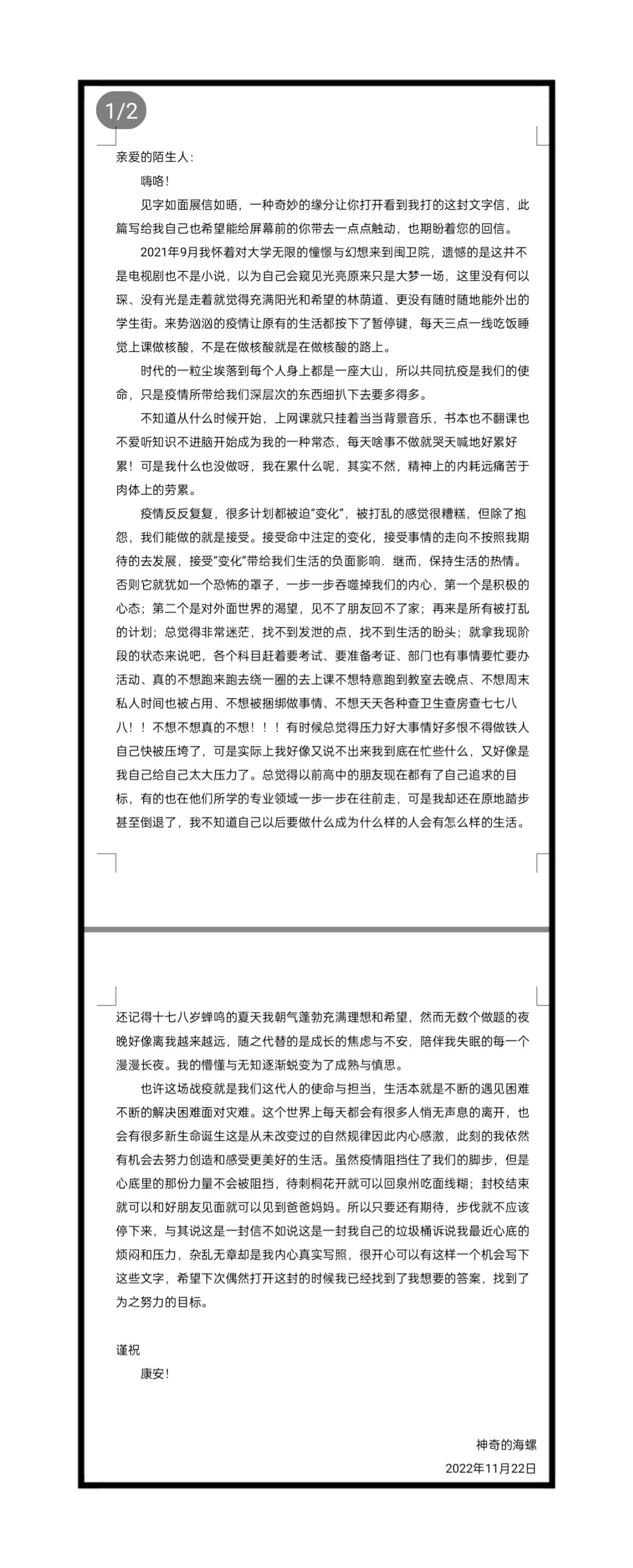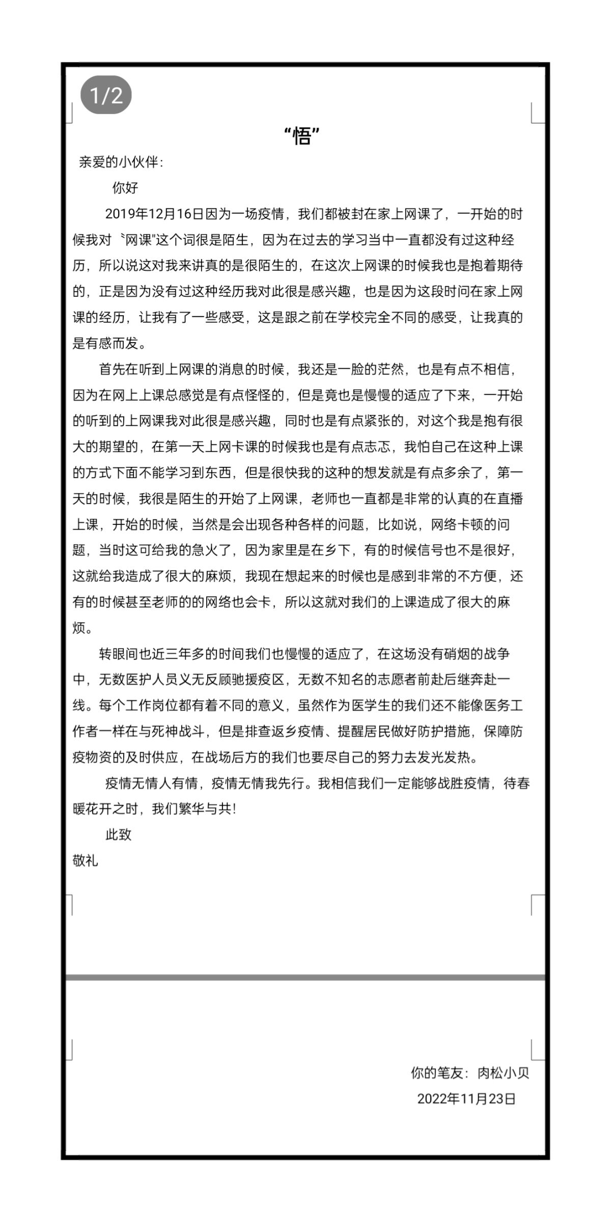 勠力同心,戰“疫”必勝。在來朋珍、徐舒寧兩位老師的指導下,本次活動舉辦圓滿成功。同學們用指尖的鍵盤敲打出積蓄已久的“心里話”,以“漂流箋”的形式來緩解疫情下同學們的心理,引導同學們發出自己的聲音:“我們終將打贏疫情這場戰役。”“堅持就是勝利!”