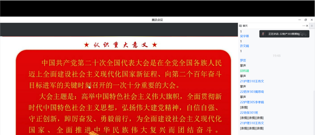 會中,蔡湘怡同學、許文娟與林瑤同學以小組為單位分別帶來了以黨的二十大為主題的宣講,在圖文并茂中敘說著當代青年的我們應怎么去踐行黨的二十大精神,如何做一個有理想、能吃苦、肯奮斗的新時代青年?