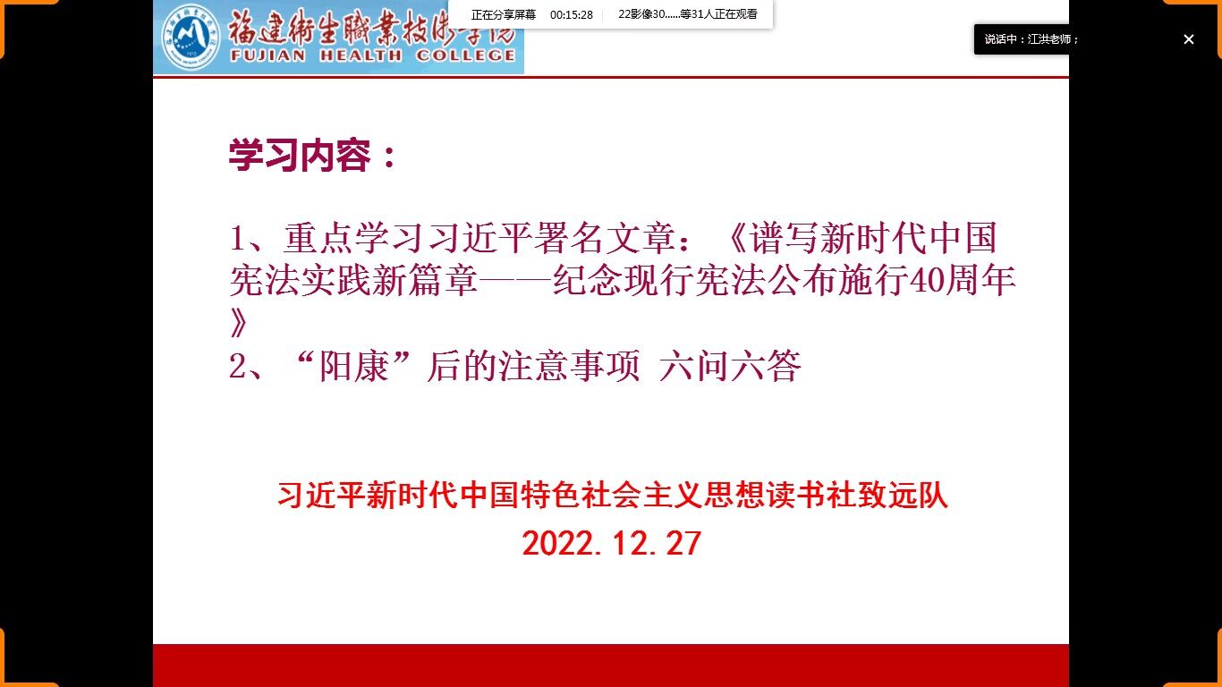 為加強學生憲法意識、弘揚憲法精神、提升學生法治素養,2022年12月27日,習近平新時代中國特色社會主義思想讀書社致遠隊在江洪老師的組織下,線上開展學習習近平總書記于2022年12月19日發表的重要文章《譜寫新時代中國憲法實踐新篇章——紀念現行憲法公布施行40周年》。讀書社致遠隊新老成員30多人按時參加了活動。