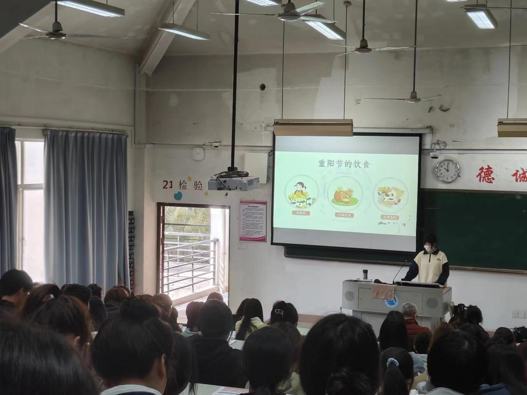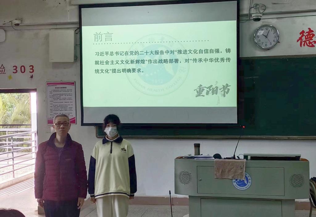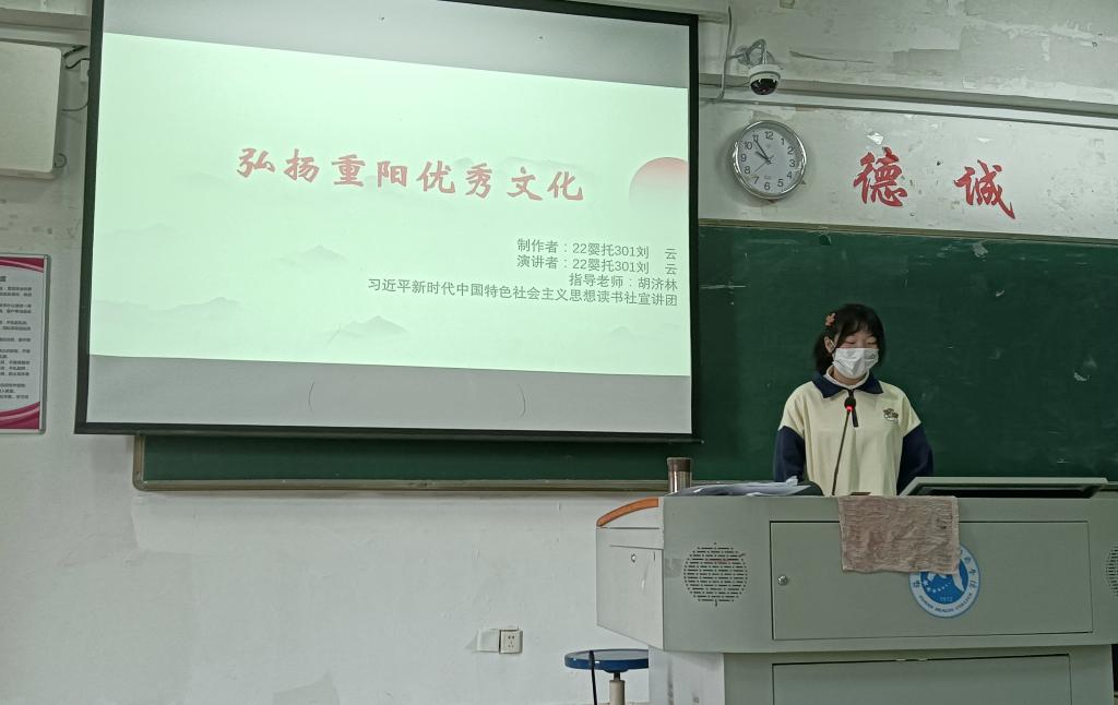 本次宣講人是22嬰托301的劉云,宣講的主題是弘揚重陽優秀文化。劉云首先以小視頻的形式向大家展示了重陽節的由來,其次介紹了重陽節的不同名稱和重陽節的習俗。讓同學們深度了解重陽節是我國的傳統節日,已列入首批國家級非物質文化遺產名錄,每年農歷九月初九為老年節,她以重陽節要關心老人,弘揚中國孝道為結尾結束本次宣講。