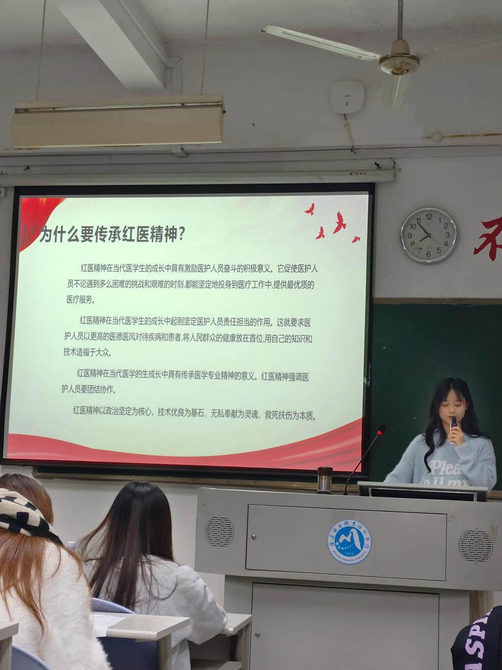 本次宣講人是23中藥301的施語彤,宣講的主題是紅醫精神。施語彤在介紹紅醫精神的內涵后,用小視頻的形式給大家介紹了紅醫精神的代表人物,然后講述了作為新時代大學生的我們應該如何傳承紅醫精神,最后她以向具有紅醫精神的醫護人員致以最崇高的敬意來結束本次宣講。
