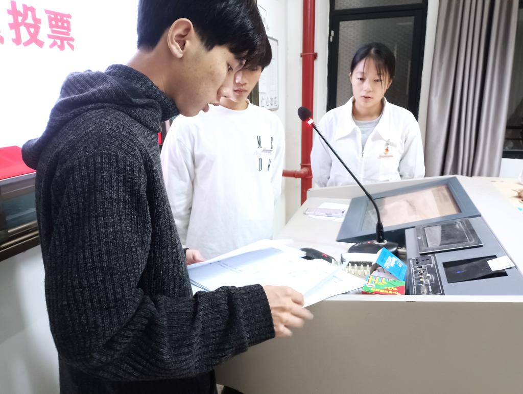 大會(huì)第三項(xiàng)議程:功能型團(tuán)支部委員會(huì)選舉。劉羽珊宣讀選票填寫規(guī)則及其注意事項(xiàng),監(jiān)票人發(fā)放選票。各位團(tuán)員填寫選票后由檢票員收集,收集完畢由監(jiān)票人和選舉工作人員驗(yàn)票,由記票人員記票。