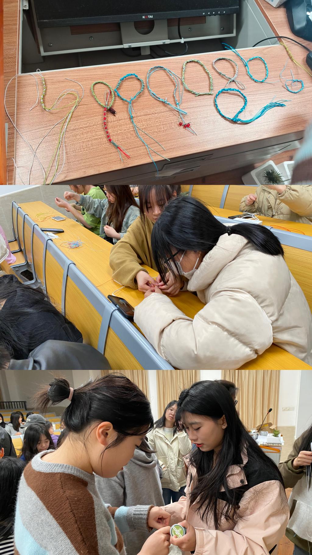 日月陽陰兩均天,玄鳥不辭桃花寒。本次活動以“春”為主題,五人一組編織手繩,領取手繩材料后,在規定時間內自由發揮編織完成作品。
