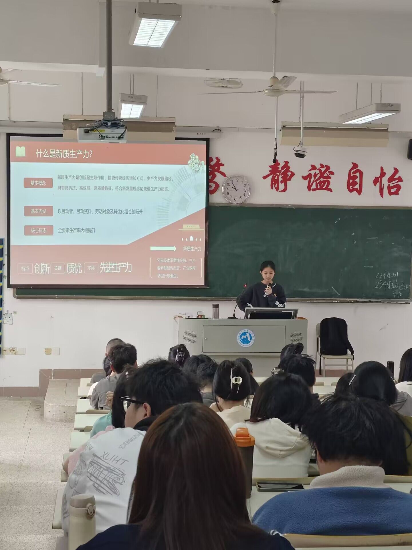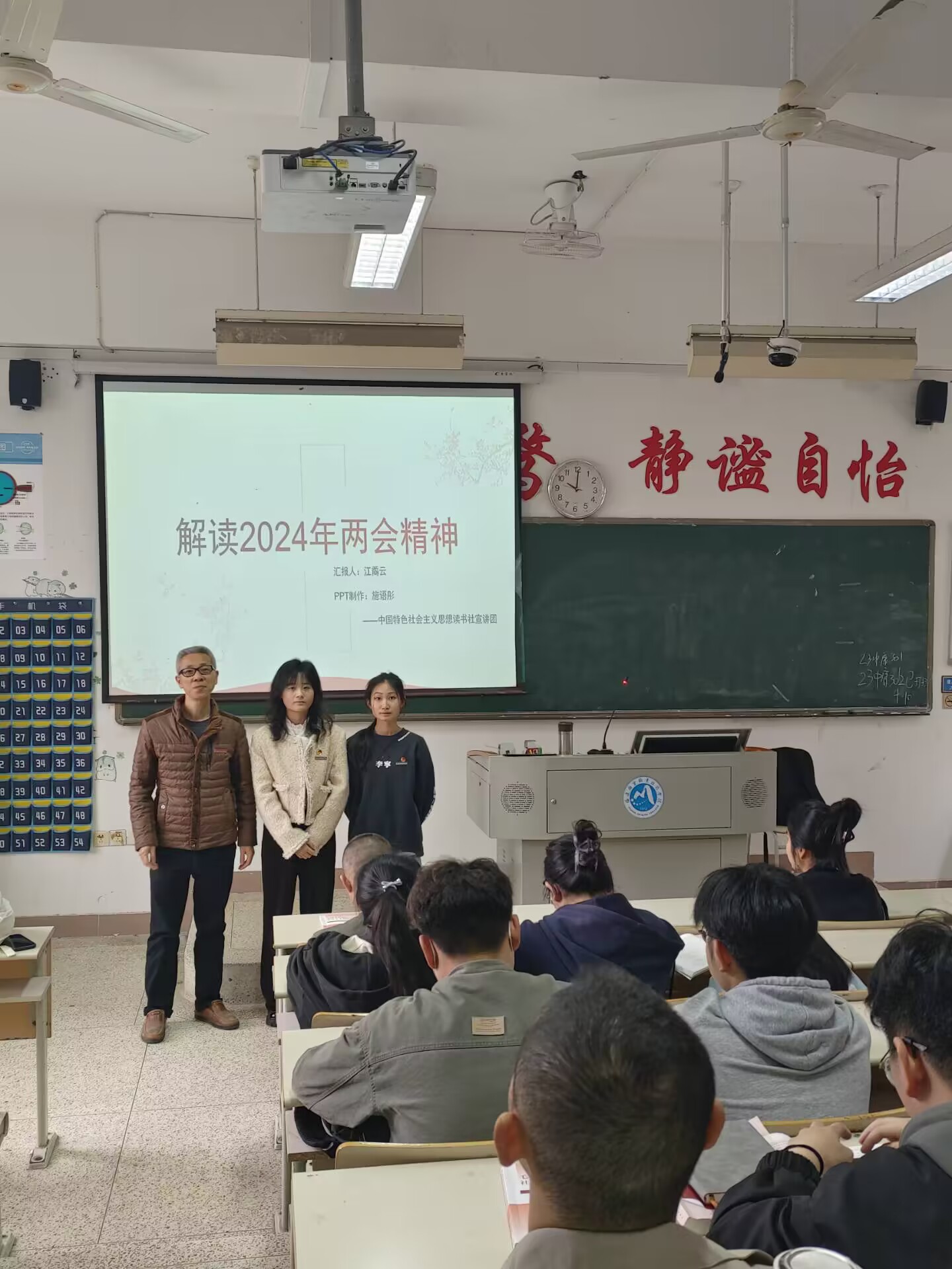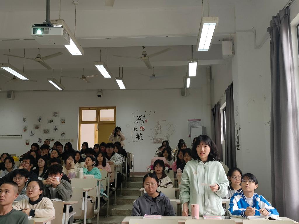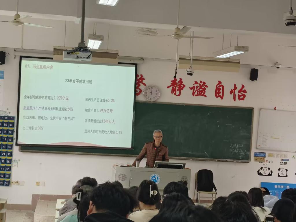 兩會精神具有鮮明的時代特征和針對性,它反映了黨和國家在新時期的工作重點和發展方向。在兩會精神的指導下,各級政府和社會各界應該緊密團結在一起,共同為實現國家的繁榮富強和人民的幸福安康而努力奮斗。學習貫徹兩會精神是當代大學生的責任和義務。為了更好地學習兩會精神,2024年4月10日,習近平新時代中國特色社會主義思想讀書社宣講團成員在胡濟林老師的組織下,到教學樓114為23中藥301、302班的同學們開展線下宣講交流。