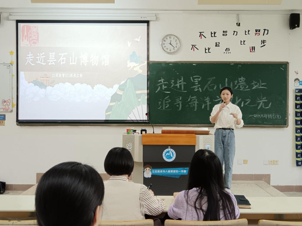 經過歷時半月的選拔,15名參賽者脫穎而出,于2024年5月23日在崇教樓112教室參加“走進曇石山遺址,追尋海洋文化之光”講解大賽半決賽。本次比賽由時代先鋒協會社長張芯語同學主持,社團指導老師丁愛芝、張晨琳擔任評委。