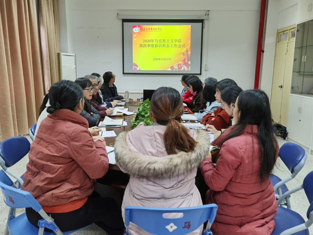2020年12月17日上午,馬克思主義學院在行政樓107會議室召開2020年第四季度意識形態工作會議。會議由馬克思主義學院黨支部書記熊美蘭主持,馬院全體教師黨員參加會議。