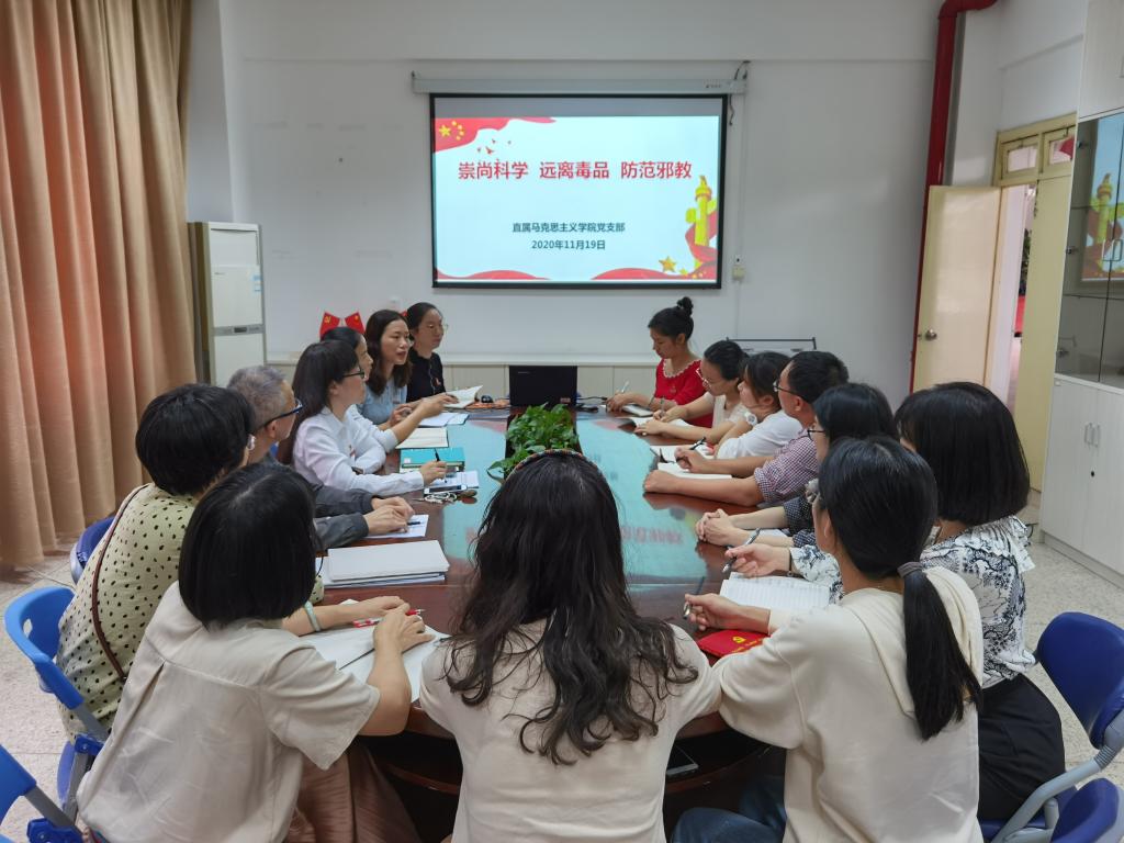 為進一步提高廣大教師識邪辨邪防邪拒邪和科學防疫的意識和能力,11月19日下午,直屬馬克思主義學院黨支部在行政樓107會議室開展“崇尚科學 遠離病毒 防范邪教”學習宣傳活動。本次活動由直屬馬克思主義學院黨支部書記熊美蘭主持,支部全體教師黨員參加了活動。