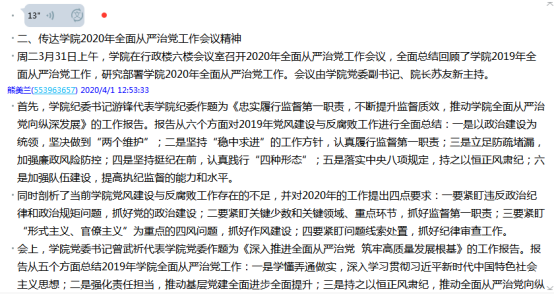 2020年4月1日下午,直屬馬克思主義學院黨支部通過網絡在QQ群召開2020年全面從嚴治黨工作會議。會議由黨支部書記熊美蘭主持,全體黨員參加了會議。