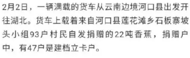 贈350噸“壽光蔬菜”后,山東再捐2000余噸蔬菜水果。河南一個國家級貧困縣的村子為武漢捐了十萬斤大蔥。因為倉促聯系不到機械,300多個村民到地里用手硬拔了三天。他們是來自河南洛陽嵩縣閆莊鎮竹園溝村!云南紅河哈尼族彝族自治州河口縣蓮花灘鄉石板寨向武漢捐了22噸香蕉。摘完香蕉后,用摩托車隊運送下山,交給司機們接力運送,其中一個司機開了1800公里。他說:父親曾經在武漢服役。