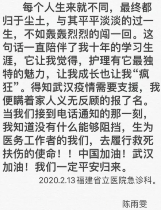 在出發的時候,她寫到:“每個人生來就不同,最終都歸于塵土,與其平平淡淡的過一生,不如轟轟烈烈的闖一回。這句話一直陪伴我十年的學習生涯,它讓我覺得,護理有它最獨特的魅力,讓我成長也讓我“瘋狂”。得知武漢疫情需要支援,我便瞞著家人義無反顧的報了名,當我們接到電話通知的那一刻,我知道沒有什么能夠阻擋,生為醫務工作者的我們,去履行救死扶傷的使命!中國加油!武漢加油!我們一定平安歸來。”這不是豪言壯語,而是作為一名護理人員發出的心聲,她僅想用自己所學到的知識多就一些人。