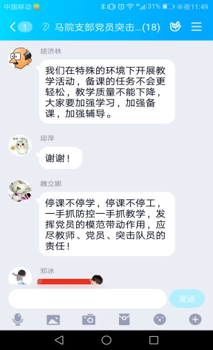 為進一步做好新型冠狀病毒疫情防控工作,根據(jù)學(xué)校疫情防控工作領(lǐng)導(dǎo)小組的工作部署,2020年2月19日晚,直屬馬克思主義學(xué)院黨支部通過QQ線上平臺召開全體黨員學(xué)習(xí)教育會。會議由黨支部副書記來朋珍主持,馬院全體教師黨員參加了會議。