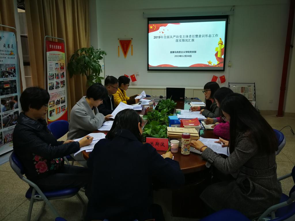 2019年12月30日下午,學校全面從嚴治黨主體責任暨意識形態工作專項巡查“回頭看”交叉巡查組組長曾武祈書記、成員阮秋容、吳華、程劍芬一行到馬克思主義學院行政樓107會議室檢查2019年度直屬馬克思主義學院黨支部全面從嚴治黨主體責任暨意識形態工作落實情況。直屬馬克思主義學院黨支部全體委員參加會議。