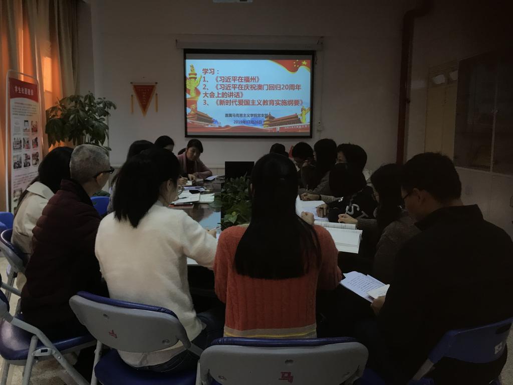 2019年12月26日上午,直屬馬克思主義學院黨支部組織全體黨員集中學習《習近平在福州》、《習近平在慶祝澳門回歸20周年大會上的講話》、《新時代愛國主義教育實施綱要》?;顒佑牲h支部書記熊美蘭主持,支部全體教師黨員參加了活動。