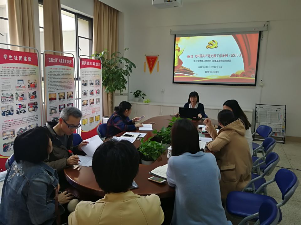 為使廣大黨員深入領會《中國共產黨支部工作條例(試行)》(后簡稱《條例》)精神,全面掌握《條例》內容,增強貫徹執行《條例》的思想自覺和行動自覺,2019年3月28日,直屬馬克思主義學院黨支部書記熊美蘭為支部全體黨員上黨課,宣傳解讀《條例》,支部全體黨員參加了這次學習。