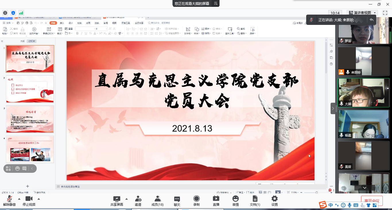 2021年8月13日上午,直屬馬克思主義學院黨支部全體黨員齊聚“云端”開展線上理論學習,活動由黨支部書記熊美蘭主持。