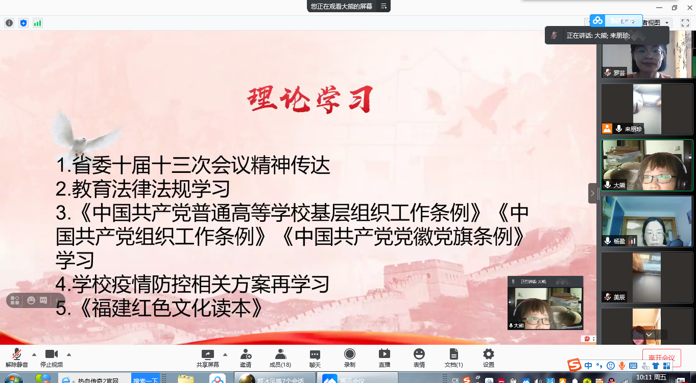 會議中,黨支部組織委員楊盈從修訂背景、修訂內容、修訂意義等三方面帶領大家學習了《中華人民共和國教育法(2021修正)》。羅蕓同志結合支部實際給大家解讀了《中國共產黨黨徽黨旗條例》《中國共產黨組織工作條例》《中國共產黨普通高等學校基層組織工作條例》,加深了全體黨員對黨組織條例規定的認識。為用好福建紅色資源,傳承福建紅色基因,守護福建紅色江山,本次理論學習還進行了《福建紅色文化讀本》研學活動,由陳洪月老師進行交流分享。此外,因近期國內疫情多地多點呈現散發態勢,疫情防控形勢異常嚴峻,黨支部還組織全體黨員再次學習了疫情防控“兩案九制”,熊美蘭強調,全體黨員同志要緊繃疫情防控的思想之弦,嚴格落實疫情防控措施。
