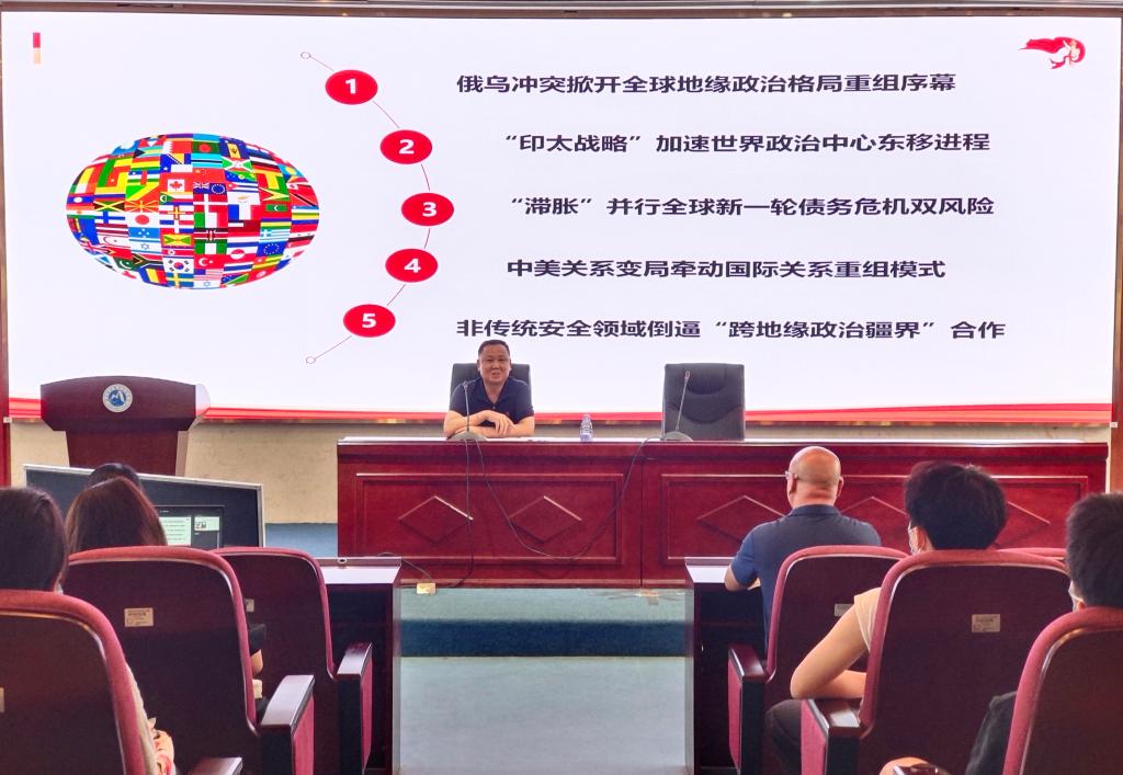 曾武祈著重梳理了當前復雜多變的國際局勢、黨和國家面臨的安全挑戰及其背后動因,為黨員們帶來了一堂理論深刻、視野開闊、內容豐富,極具吸引力和感染力的黨課。在他的講述中,全體黨員充分感受到了中國在全球變局中化危為機、勇毅前行的卓越能力。曾武祈指出,黨的二十大必將擘畫發展新藍圖,贏得更加偉大的勝利和榮光。廣大黨員教師應比以往更加堅定地迎接世界的變革與挑戰,以實際行動詮釋自己對國家和民族的責任和擔當。