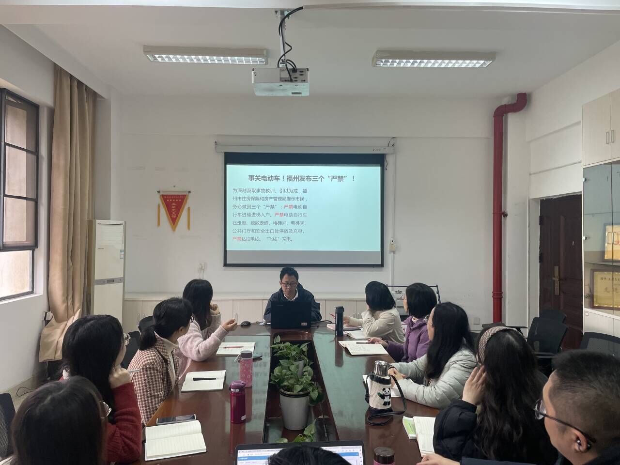 張天文深入分析南京雨花臺區電動車火災事故發生原因,并結合福州市住房保障和房產管理局提出的“三個嚴禁”,警示全體教師黨員吸取教訓,引以為戒,建立正確的用車觀念和充電方法。