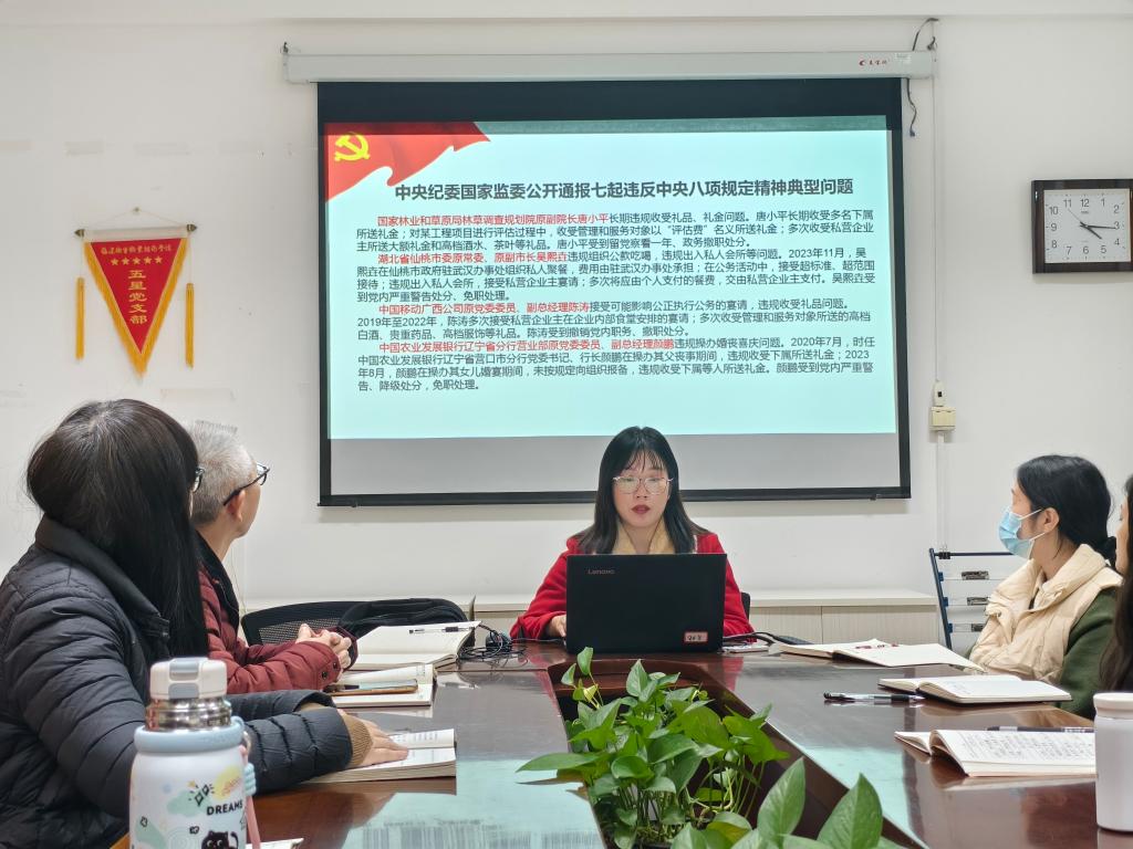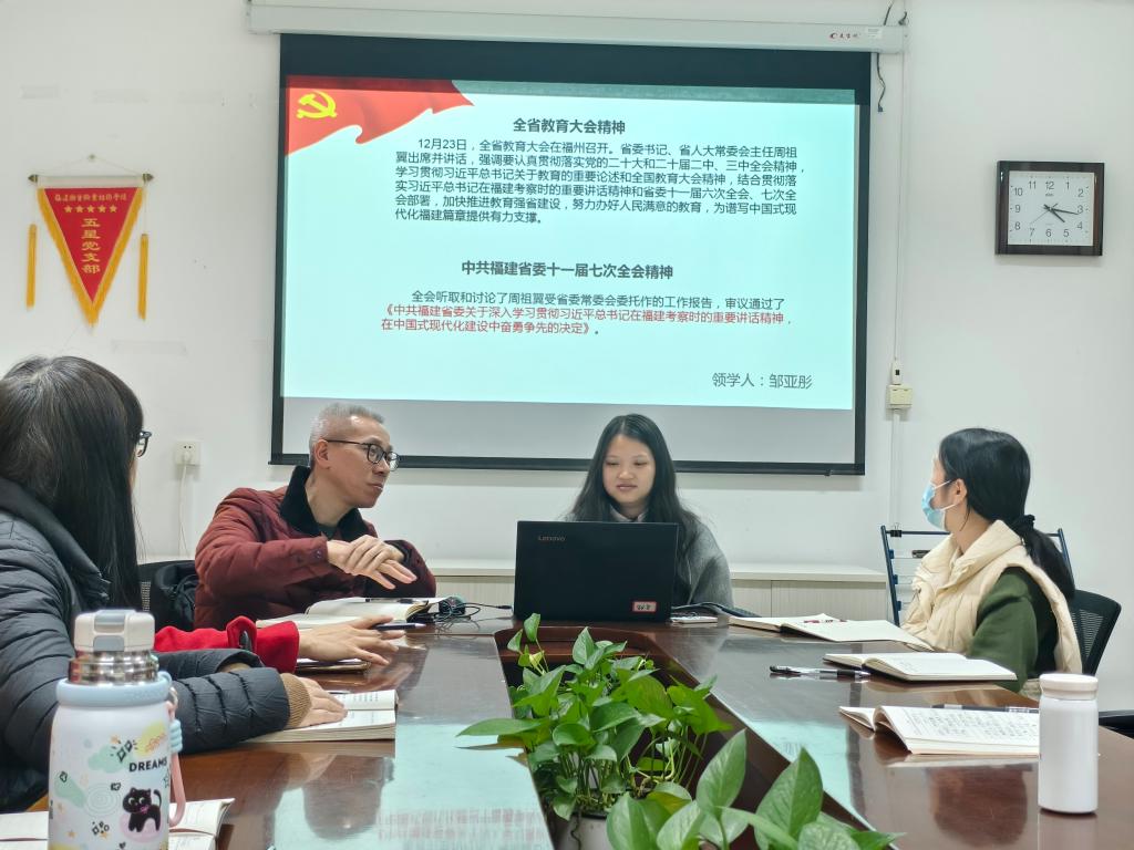 會上,蔣楠同志領學習近平總書記重要文章《深入推進黨的自我革命》。文章指出,黨的十八大以來,在推進全面從嚴治黨的偉大實踐中,我們不斷進行實踐探索和理論思考,在毛澤東同志當年給出“讓人民來監督政府”的第一個答案基礎上,給出了第二個答案,那就是不斷推進黨的自我革命。鄒亞彤同志領學習近平總書記在福建考察時的重要講話精神、中共福建省委十一屆七次全會精神、全省教育大會精神。楊盈同志結合2025年元旦春節期間正風肅紀工作,領學中央紀委國家監委公開通報七起違反中央八項規定精神典型問題。