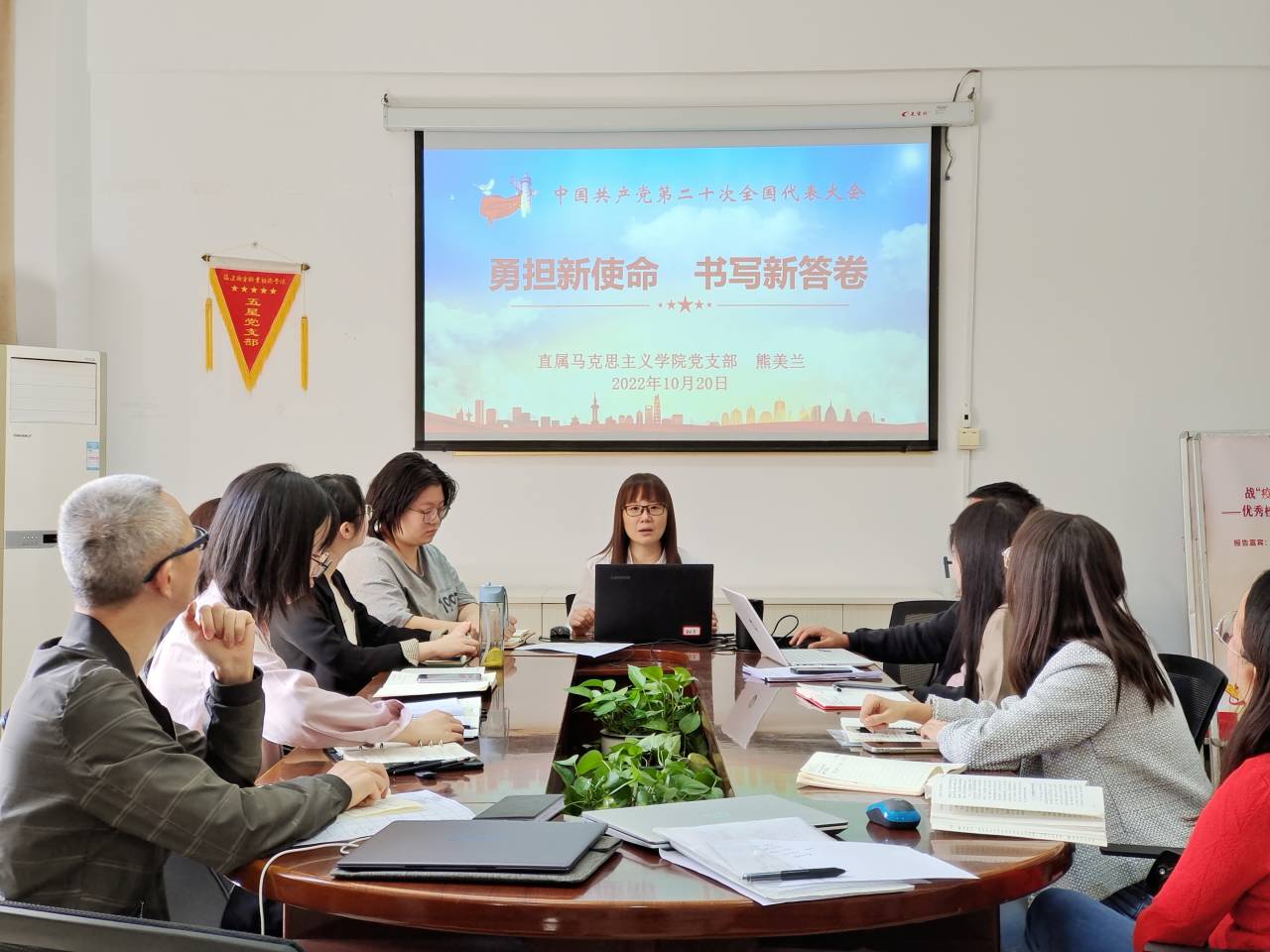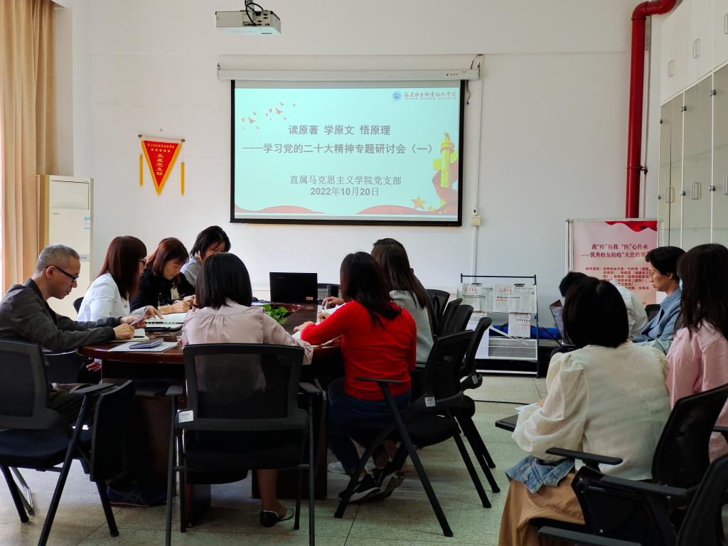 為學習宣傳和研究闡釋黨的二十大精神,用習近平新時代中國特色社會主義思想凝心鑄魂,引領新時代青年學生踔厲奮發、勇毅前行,2022年10月20日,直屬馬克思主義學院黨支部在會議室107開展黨的二十大報告專題研討會,活動由黨支部書記熊美蘭主持。