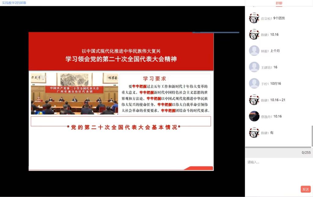 習(xí)近平總書記在黨的二十大報(bào)告中指出,在中華人民共和國成立特別是改革開放以來長期探索和實(shí)踐基礎(chǔ)上,經(jīng)過黨的十八大以來在理論和實(shí)踐上的創(chuàng)新突破,我們黨成功推進(jìn)和拓展了中國式現(xiàn)代化。為幫助社團(tuán)成員學(xué)習(xí)領(lǐng)會(huì)黨的二十大精神,2022年11月16日,集雅軒書畫協(xié)會(huì)成員齊聚云端,馬克思主義學(xué)院教師張茵珠開展了以“以中國式現(xiàn)代化全面推進(jìn)中華民族偉大復(fù)興——學(xué)習(xí)領(lǐng)會(huì)黨的第二十次全國代表大會(huì)精神”為主題的宣講。此次活動(dòng)是馬克思主義學(xué)院學(xué)習(xí)貫徹黨的二十大精神系列宣講活動(dòng)之一。