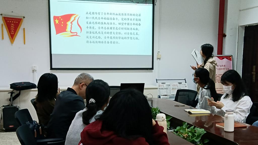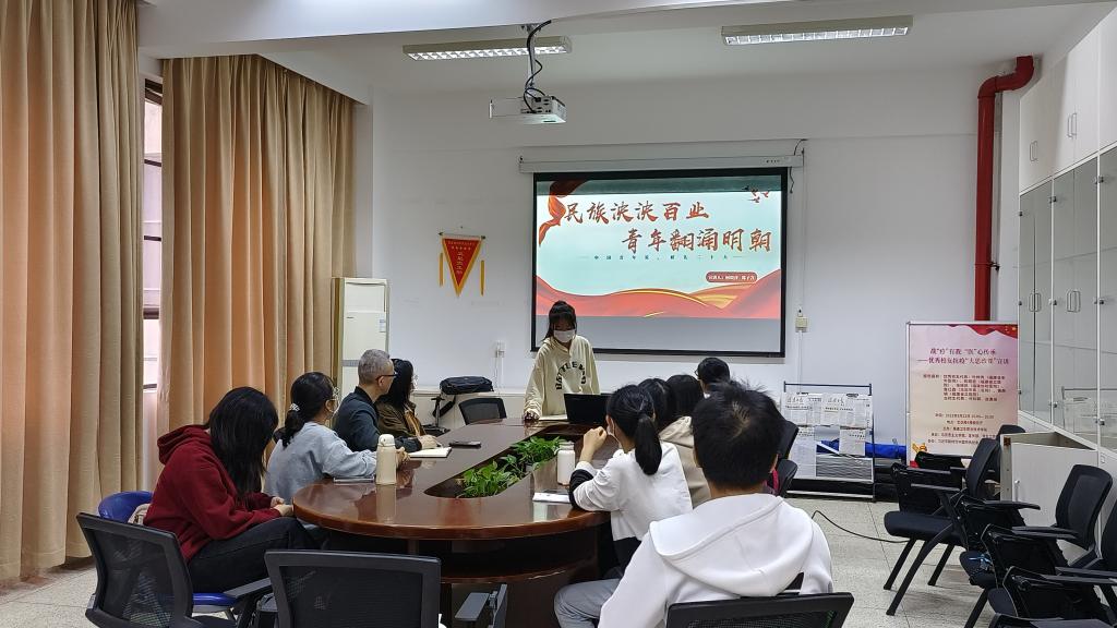 廣袤豐沃的土地孕育眾生,流傳著千古的歷史古韻。中華文化伴著江河度過百年守望,越過蒼山原野,浸潤世代華夏人。承繼百年光輝歷史,時代向前,青年向上。青年勇敢追逐青春夢想,勇擔時代重任,凝聚起筑夢新時代,奮進新征程的強大力量。2022年11月23日上午,習近平新時代中國特色社會主義思想讀書社青春隊在胡濟林老師的組織下,在行政樓107馬克思主義學院會議室開展線下交流。在面對面交流中,我們向同學宣講黨的二十大精神,促進同學們學習貫徹黨的二十大精神的政治自覺和行動自覺,提高同學們的使命感和責任感。