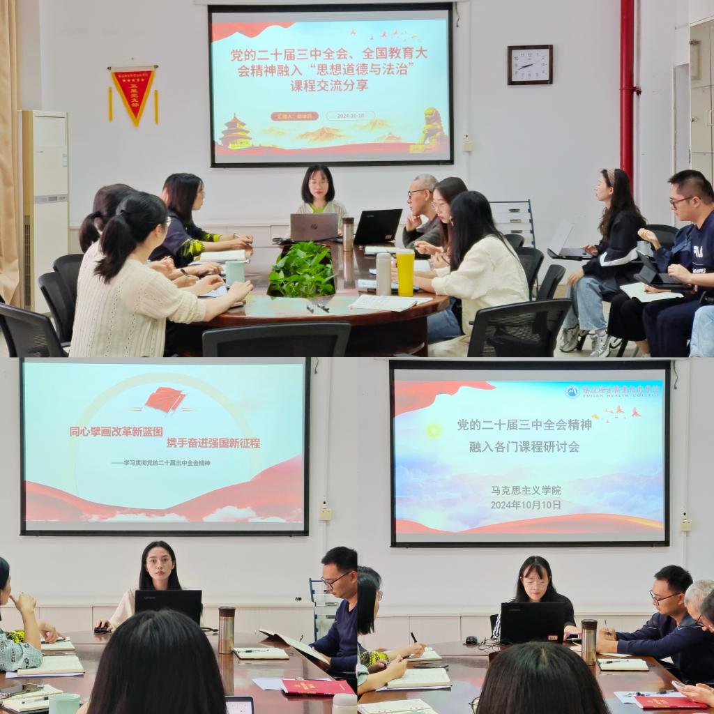 接著,顏冰鳳老師分享了黨的二十屆三中全會精神融入“思想道德與法治”具體案例,提出要以問題為導向,結合黨的二十屆三中全會、全國教育大會精神和教學重難點設置問題鏈,精心組合情景式教學、自主探究、案例分析等多種教學方式和手段幫助學生突破教學重難點,提升學生學習實效。張茵珠老師根據“形勢與政策”開學第一課及校領導關于學習貫徹黨的二十屆三中全會精神專題內容所提建議,結合近期培訓學習收獲談到要準確理解黨和國家理論政策,通過科學嚴謹的方法在教學過程中證明并展示政策的正面效應。龍慧老師聚焦“高職醫學生職業發展與就業創業”課程進行分享交流,黨的二十屆三中全會和全國教育大會為職業發展與就業創業指明了方向,將會議精神融入課程,有利于讓學生明白當前國家就業形勢和政策,引導學生根據國家需要和社會需求規劃自己的職業,選擇合適的就業方向。