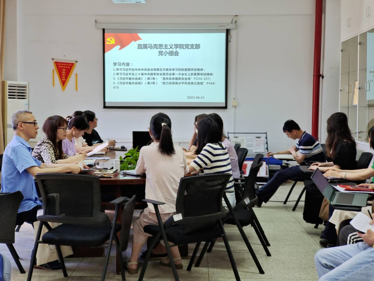 2023年6月1日,直屬馬克思主義學院黨支部在行政樓107會議室開展黨小組理論學習。會議由黨支部書記熊美蘭主持,支部全體黨員參加。