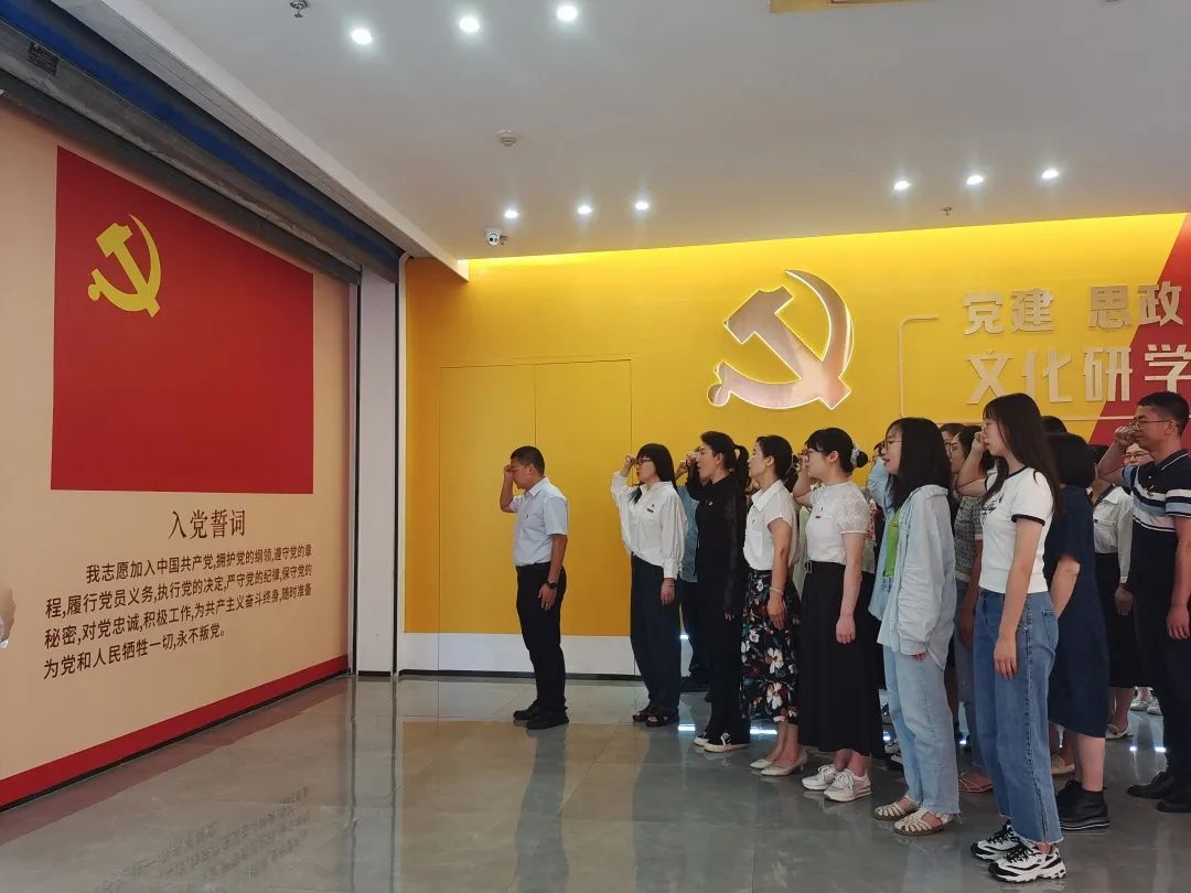 面向鮮紅的黨旗,在張建國的帶領下,全體黨員高舉右拳重溫入黨誓詞。宣誓聲響徹大廳、久久回蕩,是對初心使命的再宣誓,是接續奮斗的再出發。