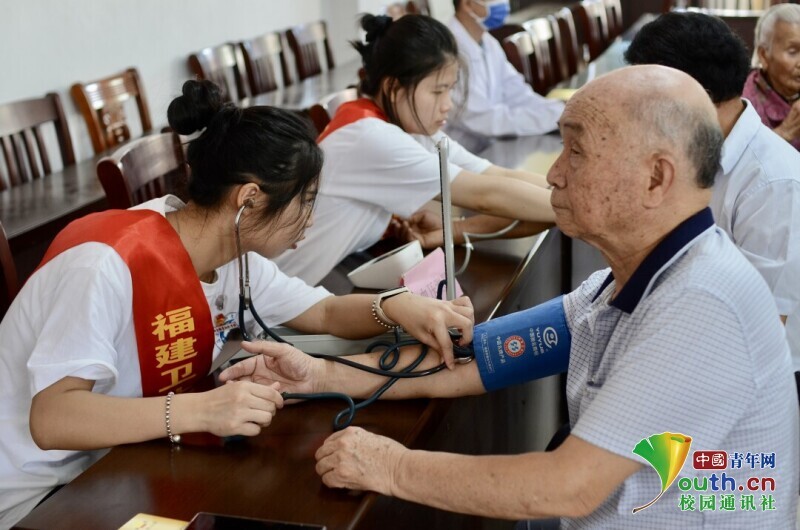 圖為“馬上逐夢”隊隊員為村民測量血壓。中國青年網(wǎng)通訊員 趙靖宇 攝